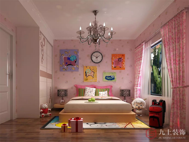 女兒房則是采用了大面積的粉色,給孩子一個(gè)夢(mèng)幻的童話(huà)夢(mèng)。