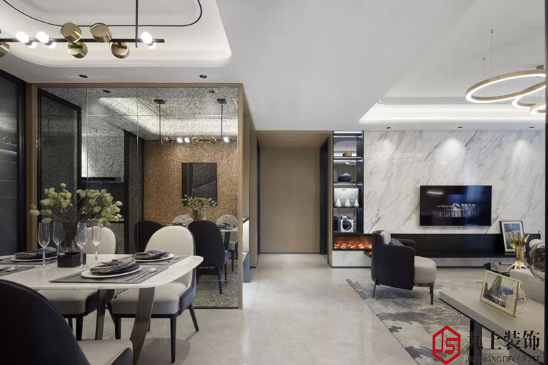 入戶(hù)玄關(guān)走廊位于戶(hù)型的中間,左右兩側(cè)分別是客廳和餐廳,餐廳的一側(cè)背景墻做了滿(mǎn)墻的鏡面設(shè)計(jì),讓餐廳看起來(lái)寬敞了不少。