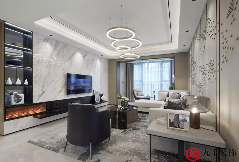 客廳的電視背景墻做了整墻大理石的設(shè)計(jì),在大理市中間留出一部分做了嵌入式的展示柜和隔板電視柜,加上藏光看起來(lái)更加大氣。