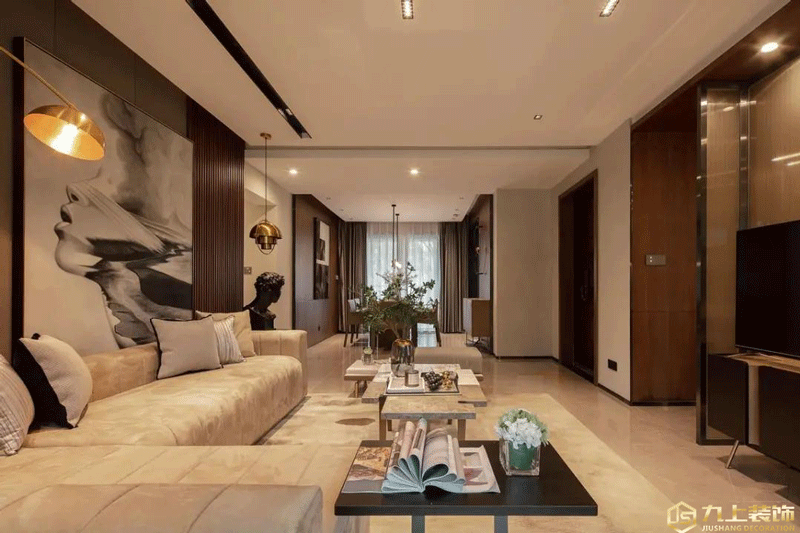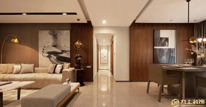 QQ咨詢(xún):客廳與餐廳空間相鄰的設(shè)計(jì),整個(gè)大廳區(qū)域的墻面加入了較多的胡桃木材質(zhì),讓空間顯得更加穩(wěn)重端莊而高級(jí)。