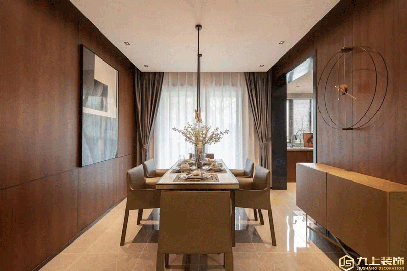 餐廳兩側(cè)的墻面也是以深色木飾面的餐桌,左側(cè)掛一幅裝飾畫(huà)、右側(cè)則是餐邊柜+極簡(jiǎn)時(shí)鐘的設(shè)計(jì),中間布置餐桌,整個(gè)用餐空間充滿(mǎn)了成熟穩(wěn)重的氣質(zhì)。