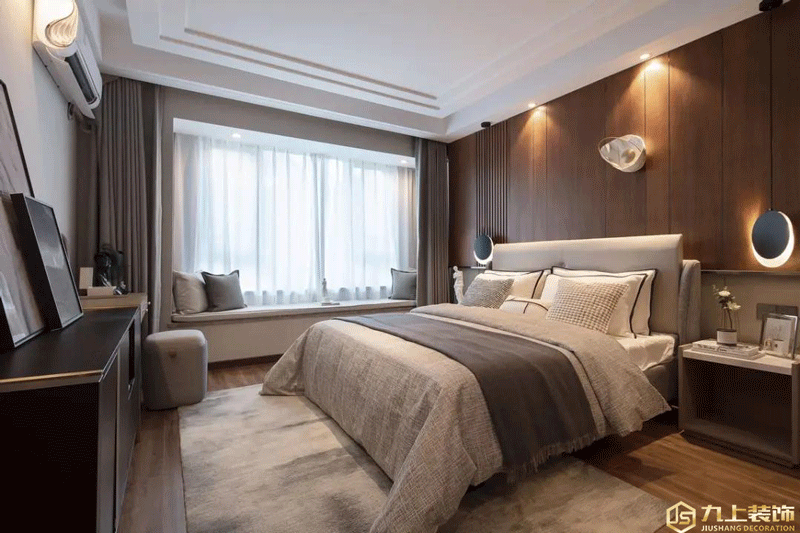 臥室在床頭墻加入木飾面的考悲劇,布置灰色皮藝床,兩側(cè)餅狀的吊燈+上方套平米鼓凳的無(wú)主燈設(shè)計(jì),天花裝著疊級(jí)的吊頂,也讓空間充滿(mǎn)層次與檔次感。