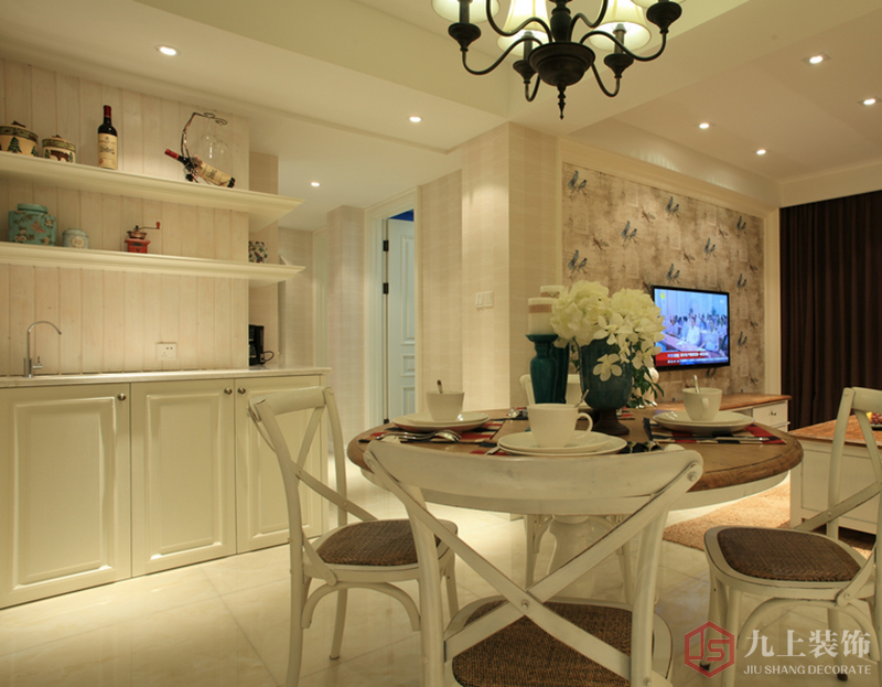 餐廳就在客廳旁桌椅均為米黃色,靠墻有酒柜裝飾。