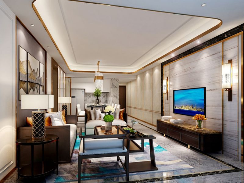 客廳輕奢金屬線條用在墻面和天花上,勾勒出華麗貴氣;背景墻與地面通過不同肌理的理石與墻板剛?cè)釥I造,色彩活潑的地毯襯托著內(nèi)斂的深棕家具,營造深淺得宜的趣味;茶幾與座椅,呼應(yīng)出中式韻味。