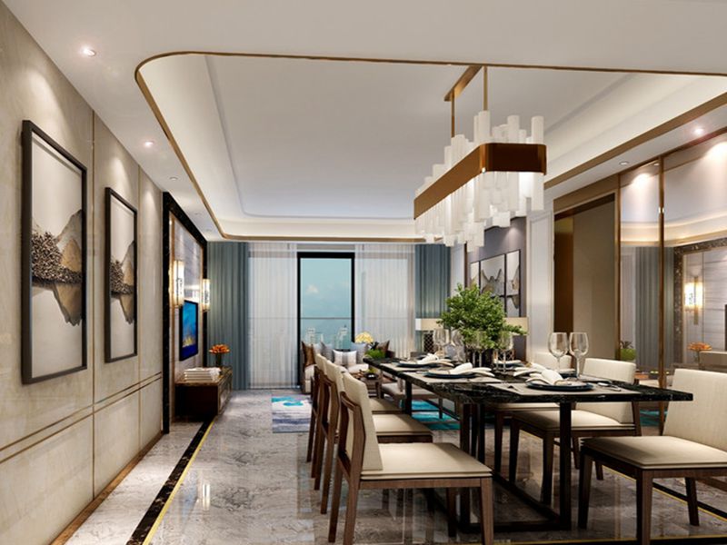 線條的或直或曲的演繹,令空間奢貴中透著東方情懷的方圓之道;同時將墻面勾畫出花屏的雅意,與穩(wěn)健方正的餐桌椅,映照在大面積的鏡面中,既形成豐富的層次,又渲染出風雅的空間氛圍。