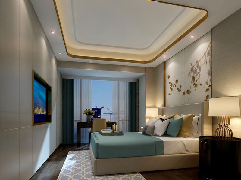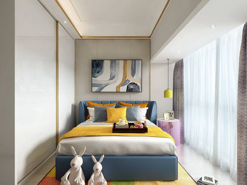 設(shè)計師利用隱形墻將衣柜與電視墻結(jié)合,打造規(guī)整且不占空間的收納方式;金線疏落的點綴在天花和墻面及燈身上,帶出雅奢氣質(zhì);包裹型雙人床上,黃白藍純色交織,與床頭墻和地毯圖案,演繹亦古亦今