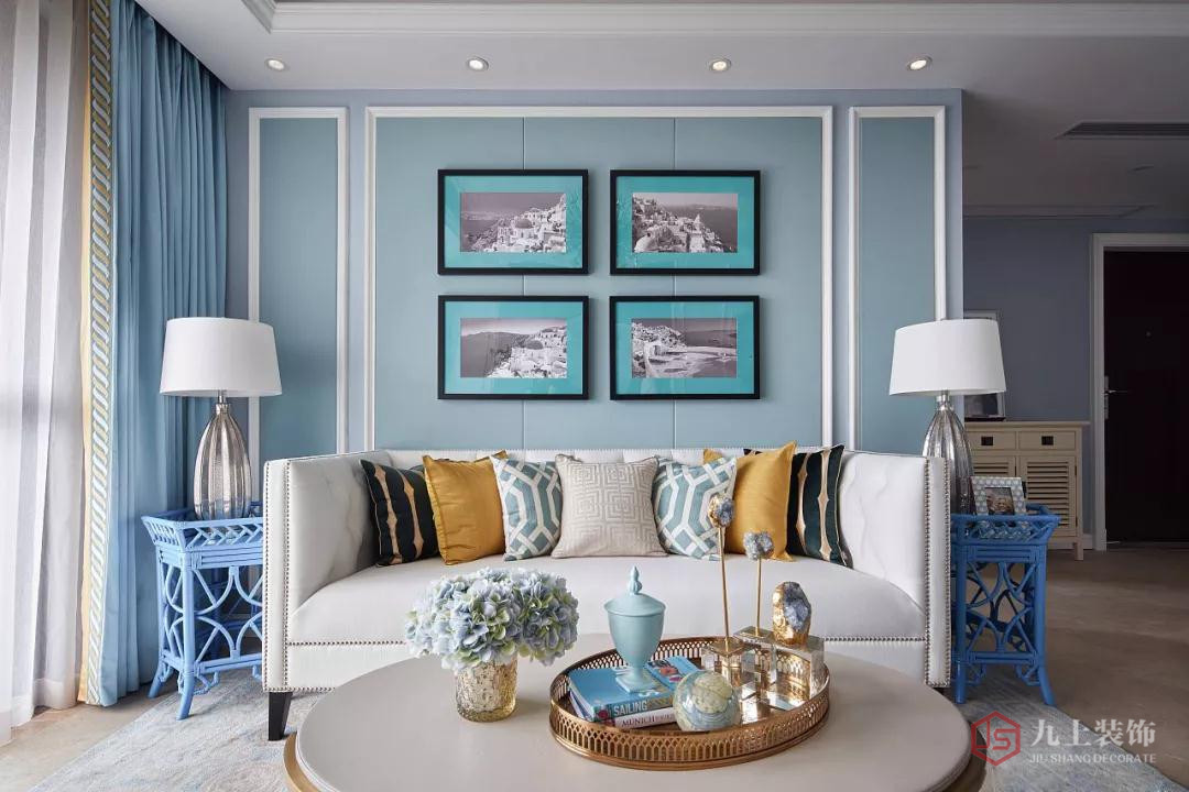 QQ咨詢:客廳配色很豐富,淡藍(lán)色的基調(diào)下搭配了很多精致的軟裝,米色布藝沙發(fā)+各種色彩的抱枕,真是溫馨優(yōu)雅極了。