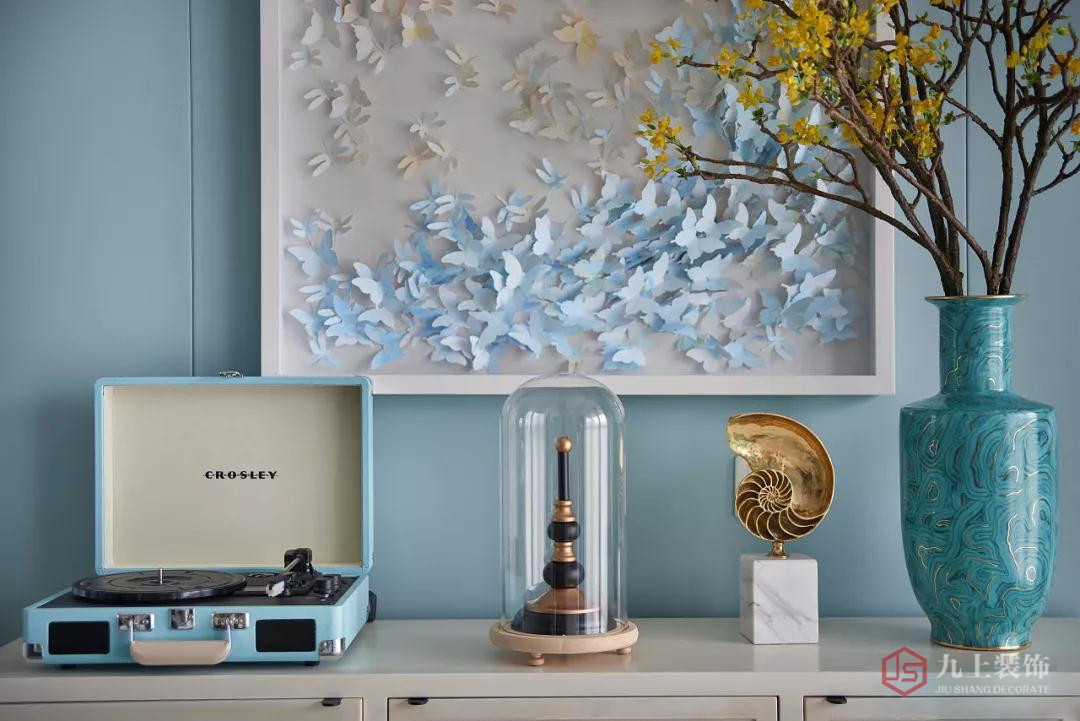 斗柜上面擺放了唱片機,還有美美的湖藍(lán)花瓶,以及一些精致的裝飾品,簡單一擺,就特別的顯檔次。