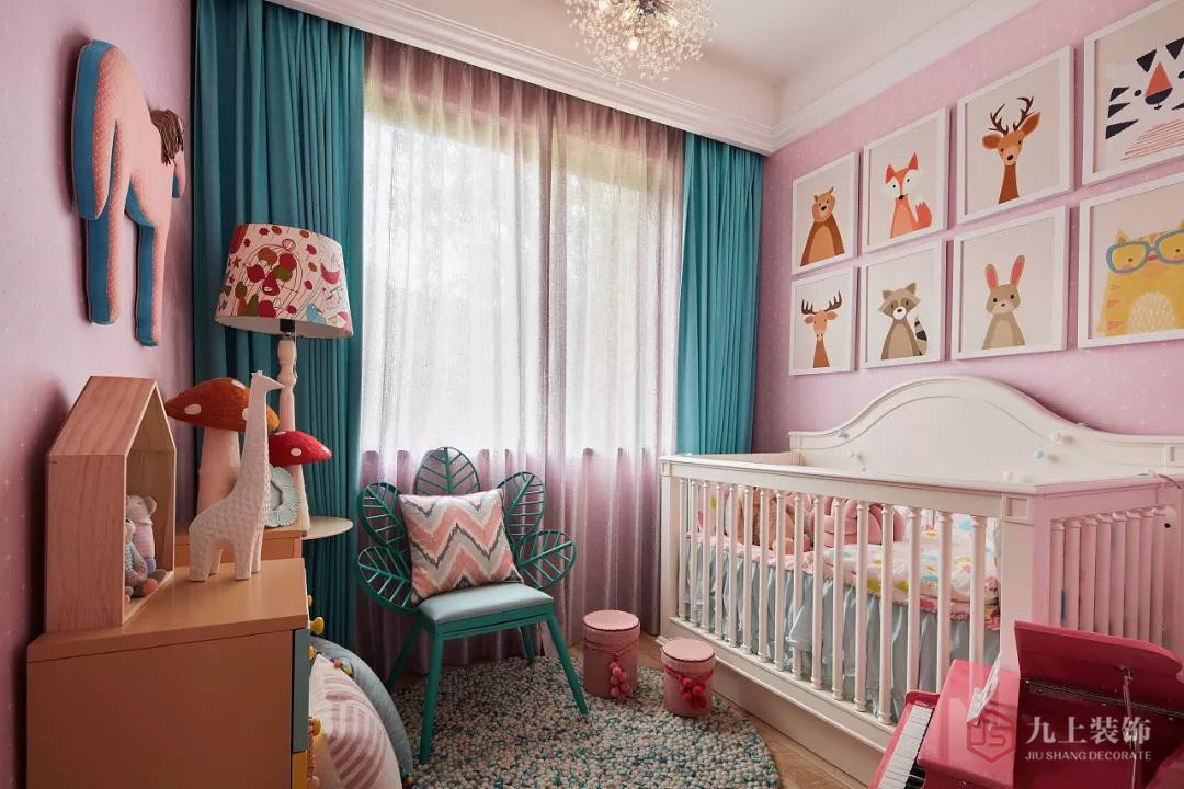 女兒房是粉嫩公主風(fēng),粉粉的墻面,用了各種各樣的動物裝飾畫去做搭配,超級可愛。嬰兒床,小尺寸的家具,都是為孩子量身打造的。